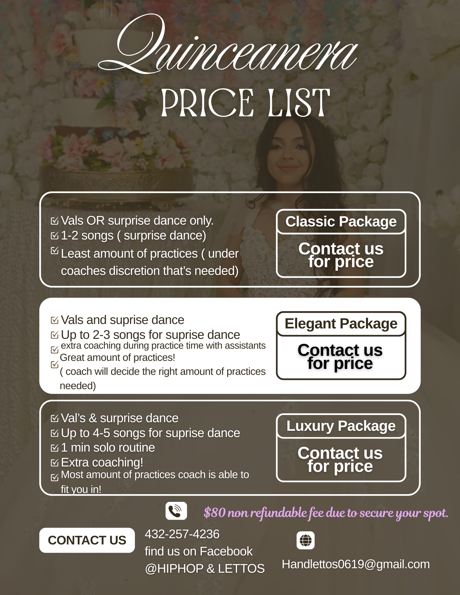 To ensure a seamless and spectacular performance, here are a few important considerations when booking your special dance package with HipHop & Lettos dance studio. We recommend booking at least 3-4 months in advance of your event to allow ample time for choreography development and practice sessions. Our packages are flexible and can include music editing, a set number of private lessons, and optional studio rental for group rehearsals. During your initial consultation, we'll discuss your event details, song choices, and desired dance style to craft a package tailored just for you. We're located in Odessa, Texas, and are excited to help you start your dance journey. The main action we want you to take after reading this page is to connect with us to discuss your needs!